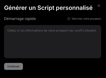 Lors de votre inscription, vous créez votre “Neuro” en détaillant votre activité et votre offre. L’outil personnalise vos scripts selon votre prospect, votre style et vos préférences.